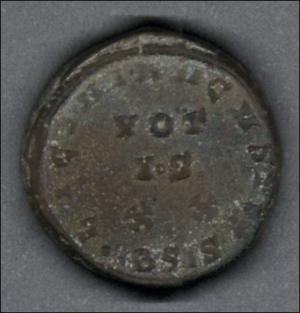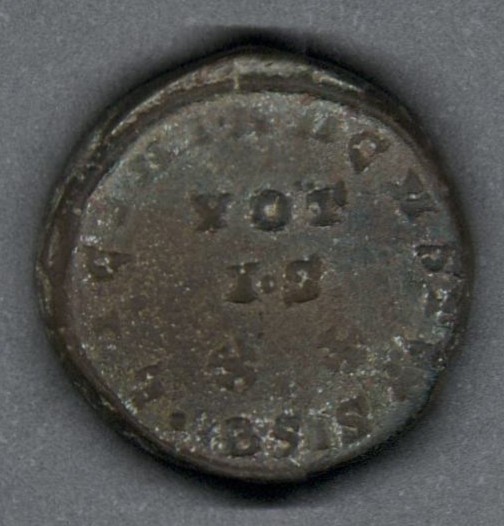 | Moneda de bronce acuñada en la ceca de Siscia en Panonia, actual Sisak en Croacia |