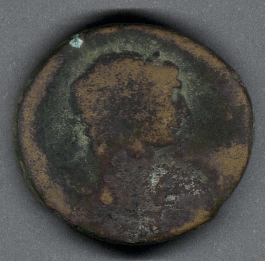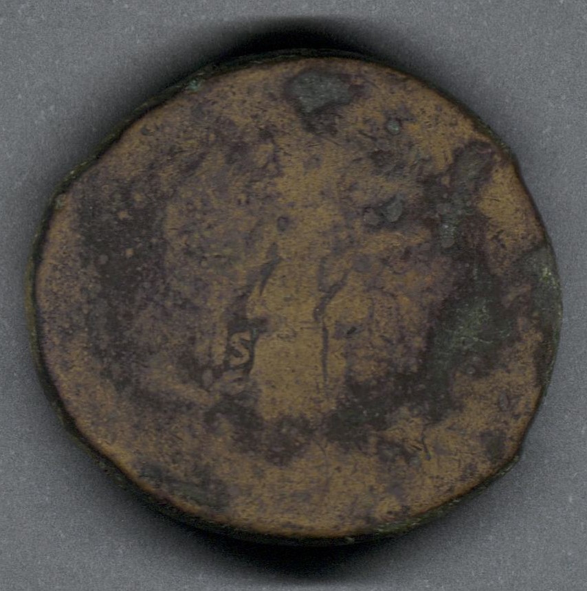 Pieza en mal estado de conservación, por lo que no es posible una identificación exacta y se propone una descripción general a partir del tipo, también se sugiere mayor investigación. Moneda acuñada por el emperador Trajano, mediante aprobación del Senado. Anverso con el busto laureado del emperador Trajano mirando a la derecha y leyenda ilegible. Reverso con una diosa drapeada de pie, leyenda ilegible y "S - (C)" en el campo. Fabricada por acuñación a martillo, peso de 25,4 gr.