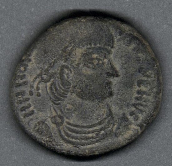 Pieza en estado de conservación regular, por lo que no es posible una identificación exacta, se propone una descripción tentativa a partir del tipo general y se sugiere mayor investigación. Moneda acuñada por el usurpador Magnencio. Anverso con el busto del emperador Magnencio llevando diadema de perlas, drapeado sobre la coraza y mirando a la derecha, leyenda parcialmente visible "D N M(AGNENTUVS P F) AVG" y borde de puntos. Reverso con el emperador de pie en atuendo militar a la izquierda, sosteniendo una Victoria con la mano derecha extendida y sosteniendo un estandarte con la mano izquierda, leyenda parcialmente visible "(FELICITA)S - RE(I PVBLICE)", exergo desgastado y borde de puntos. Fabricada por acuñación a martillo, peso de 3,4 gr.