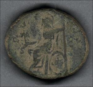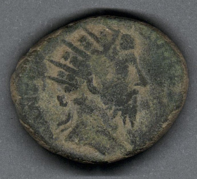 Pieza en estado de conservación regular, lo que no impide sugerir una identificación exacta. Moneda acuñada por el emperador Marco Aurelio, mediante aprobación del Senado. Anverso con el busto radiado del emperador Marco Aurelio mirando a la derecha, leyenda posible "(M ANTONINVS AVG TR P XXVI)" y borde de puntos. Reverso con la diosa Roma entronada a la izquierda, sosteniendo el Paladio en la mano derecha y una lanza con la mano izquierda y debjo, un escudo, leyenda posible "(IM)P V(I COS III)", "S - C" en el campo y borde de puntos. Fabricada por acuñación a martillo, peso de 9,5 gr.