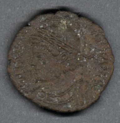 Pieza en estado de conservación regular, por lo que no es posible una identificación exacta, se propone una descripción tentativa a partir del tipo general y se sugiere mayor investigación. Moneda acuñada por el emperador Constantino I el Grande. Anverso con el busto de Constantinopla con casco laureado, llevando manto imperial y lanza sobre el hombro, leyenda desgastada "(CONSTANTINOPOLIS)" y borde de puntos. Reverso con la diosa Victoria con las alas extendidas, avanzando a la izquierda, sosteniendo una lanza con la mano derecha y un escudo con la izquierda, anepígrafa, exergo desgastado y borde de puntos. Fabricada por acuñación a martillo, peso de 1,4 gr.