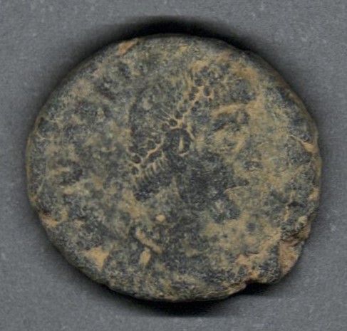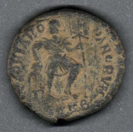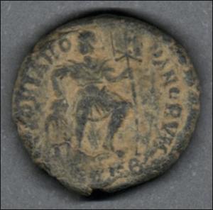 Pieza en estado de conservación regular, lo que no impide su identificación exacta. Moneda acuñada por el emperador Valente, como coemperador de su hermano Valentiniano. Anverso con el busto del emperador Valente llevando diadema de perlas y drapeado sobre la coraza mirando a la derecha, leyenda parcialmente visible "D N VALEN-(S P F AVG)" y borde de puntos. Reverso con el emperador de pie, avanzando a la derecha y mirando a la izquierda, sosteniendo el lábaro con la mano izquierda y a un cautivo con la mano derecha, leyenda "(GL)ORIA RO-MANORVM", "(SM)KB" en el exergo y borde de puntos. Fabricada por acuñación a martillo, peso de 2,9 gr.