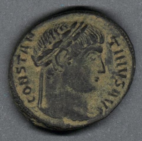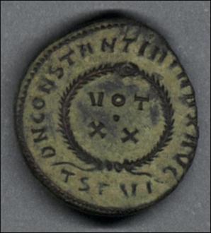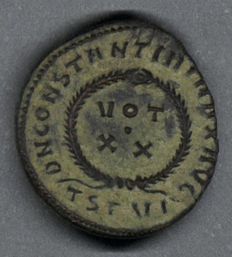 Moneda acuñada por el emperador Constantino I el Grande, como coemperador con Licinio I. Anverso con el busto laureado del emperador Constantino I a la derecha, leyenda "CONSTAN-TINVS AVG" y borde de puntos. Reverso con una guirnalda con la inscripción "VOT / · / XX", leyenda "DN CONSTANTINI MAX AVG", en el exergo "TSΓVI" y borde de puntos. Fabricada por acuñación a martillo, peso de 3,3 gr.