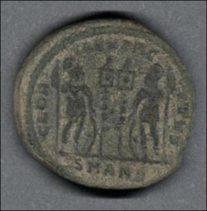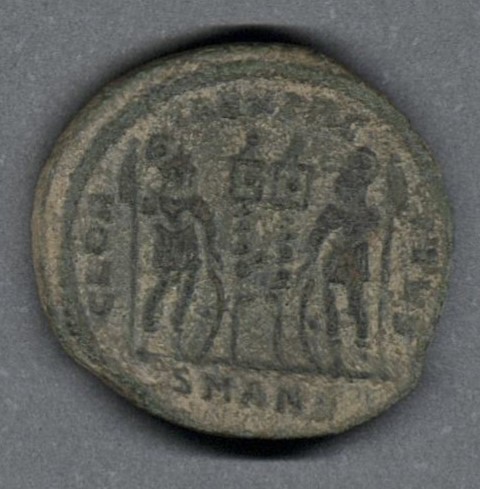 Moneda acuñada por el emperador Constantino I el Grande, como Augusto único. Anverso con el busto del emperador Constantino llevando diadema de perlas y drapeado sobre la coraza, mirando a la derecha, leyenda "CONSTANTI-NVS MAX AVG" y borde de puntos. Reverso con dos soldados de pie, sosteniendo una lanza y afirmándose en el escudo, dos estandartes militares entre ellos, leyenda "GLOR-IA EXERC-ITVS", en el exergo "SMAN(B)" y borde de puntos. Fabricada por acuñación a martillo, peso de 2,7 gr.