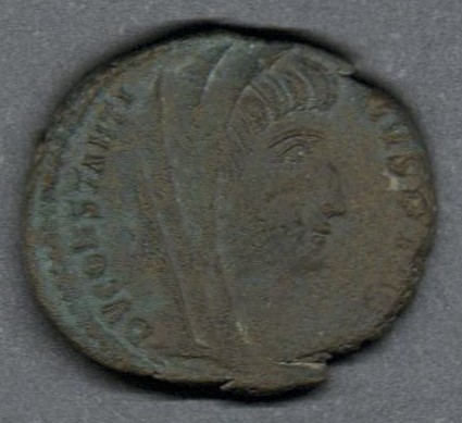Pieza en estado de conservación regular, por lo que no es posible una identificación exacta, se propone una descripción tentativa a partir del tipo general y se sugiere mayor investigación. Moneda acuñada por los hijos de Constantino I el Grande, después de su muerte; se propone Constancio II como autoridad emisora, ya que fue el sucesor más importante. Anverso con el busto velado del emperador Constantino I a la derecha, leyenda "DV CONSTANTI-NVS PT AVGG" y borde de puntos. Reverso con una cuadriga llevando al emperador Constantino I velado hacia una mano que está extendida desde el cielo junto a una estrella, anepígrafa, acuñación descentrada que no permite leer el exergo y borde de puntos. Cospel irregular. Fabricada por acuñación a martillo, peso de 1,4 gr.