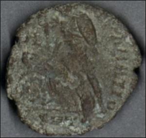 Pieza en estado de conservación regular, por lo que no es posible una identificación exacta, se propone una descripción tentativa a partir del tipo general y se sugiere mayor investigación. Moneda acuñada por los hijos de Constantino I el Grande, después de su muerte; se propone Constancio II como autoridad emisora, ya que fue el sucesor más importante. Anverso con el busto del emperador llevando diadema de perlas y drapeado sobre la coraza, mirando a la derecha, leyenda desgastada "(...)TAN-(...)" y borde de puntos. Reverso con un soldado lacerando a un "bárbaro" caído de un caballo, leyenda desgastada "(FEL TEMP - REP)ARATIO", exergo desgastado "(¿AN?)T" y borde de puntos. Fabricada por acuñación a martillo, peso de 1,8 gr.
