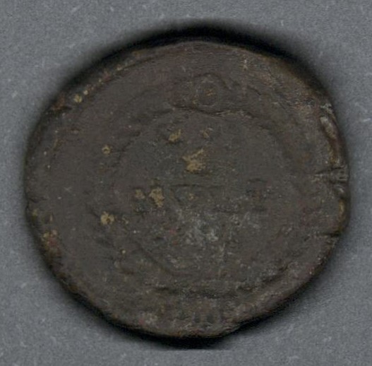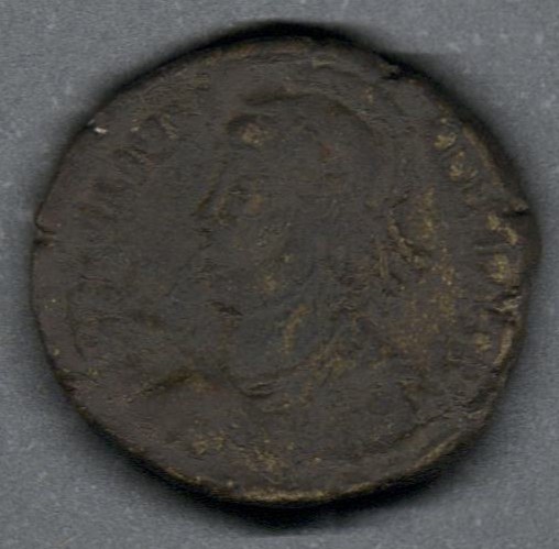 Pieza en estado de conservación regular, por lo que no es posible una identificación exacta, se propone una descripción tentativa a partir del tipo general y se sugiere mayor investigación. Moneda acuñada por el emperador Juliano II el Apóstata. Anverso con el busto del emperador Juliano II con casco y diadema de perlas mirando a la izquierda y llevando una lanza y escudo, leyenda desgastada "(DN FL CL IVLIANVS PF AVG)" y borde de puntos. Reverso con una guirnalda con la inscripción "VOT/(X)/MVLT/(XX)", exergo desgastado "(...)RO(...)" y borde de puntos. Fabricada por acuñación a martillo, peso de 3,3 gr.