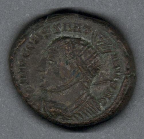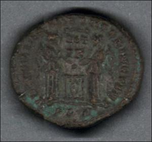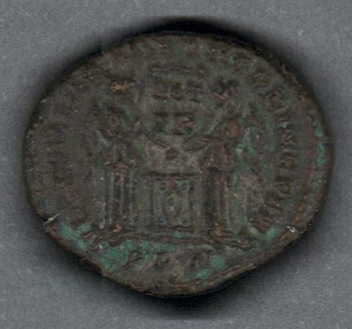 Moneda acuñada por el emperador Constantino I el Grande, como Augusto en paralelo a Licinio I. Anverso con el busto del emperador Constantino I llevando casco y coraza, sosteniendo una lanza sobre el hombro derecho y mirando a la izquierda, leyenda "IMP CONSTANT-INVS AVG" y borde de puntos. Reverso con dos Victorias de frente, sosteniendo un escudo con la inscripción "VOT / PR" sobre un altar, leyenda parcialmente legible "(VICTORIAE) LAETAE PRINC PERF", "PLN" en el exergo y borde de puntos. Fabricada por acuñación a martillo, peso de 3,4 gr.