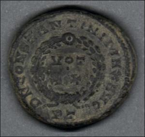 Moneda acuñada por el emperador Constantino I como Augusto en paralelo a Licinio I. Anverso con el busto laureado del emperador Constantino I mirando a la derecha, leyenda "CONSTAN-TINVS AVG" y borde de puntos. Reverso con una guirnalda con la inscripción "VOT/·/XX", leyenda "DN CONSTANTINI MAX AVG", exergo "PT" y borde de puntos. Fabricada por acuñación a martillo, peso de 2,7 gr.