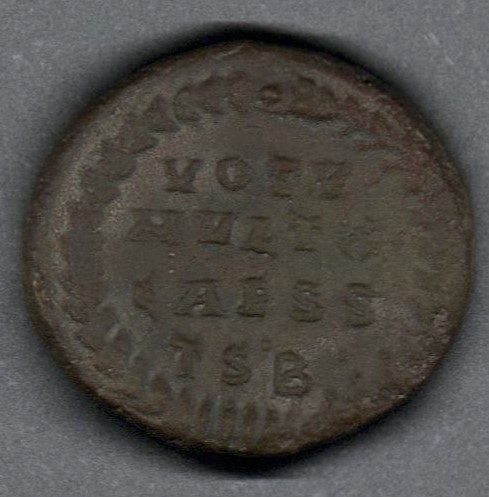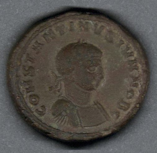 Moneda acuñada por Constantino II como César de su padre, el emperador Constantino I el Grande. Anverso con el busto laureado del César Constantino II a la derecha, llevando coraza, leyenda "CONSTANTINVS IVN NOB C" y borde de puntos. Reverso con una guirnalda con la leyenda "VOT ·V· / MVLT ·X· / CAESS / ·TS·B·" y borde de puntos. Fabricada por acuñación a martillo, peso de 3,0 gr.