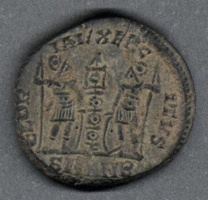 Moneda acuñada por el emperador Constantino I el Grande, como Augusto único. Anverso con el busto del emperador Constantino I mirando a la derecha, llevando diadema de rosetas y drapeado sobre la coraza, leyenda "CONSTANTI-NVS MAX AVG" y borde de puntos. Reverso con dos soldados de pie, sosteniendo una lanza y afirmándose en los escudos, con un estandarte entre ambos, leyenda "GLOR-IA EXERC-ITVS", en el exergo "SMANB" y borde de puntos. Fabricada por acuñación a martillo, peso de 1,8 gr.
