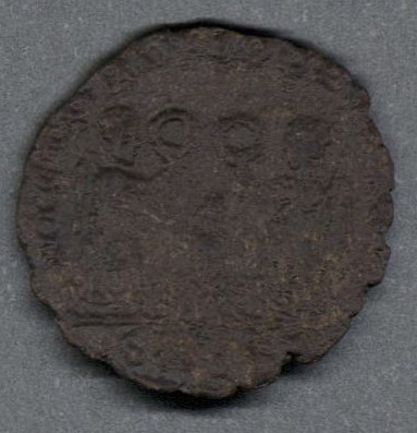 Pieza en mal estado de conservación, por lo que no es posible una identificación exacta y se propone una descripción general a partir del tipo, también se sugiere mayor investigación. Moneda probablemente acuñada por la dinastía constantiniana, posiblemente Constante o Constancio II. Anverso muy desgastado, con busto del emperador con diadema mirando a la derecha, leyenda ilegible. Reverso con dos Victorias avanzando frente a frente y llevando guirnaldas; leyenda parcialmente visible, se propone "VICTO(RIAE DD AVGGQ NN)", exergo ilegible. Fabricada por acuñación a martillo, peso de 1,0 gr.