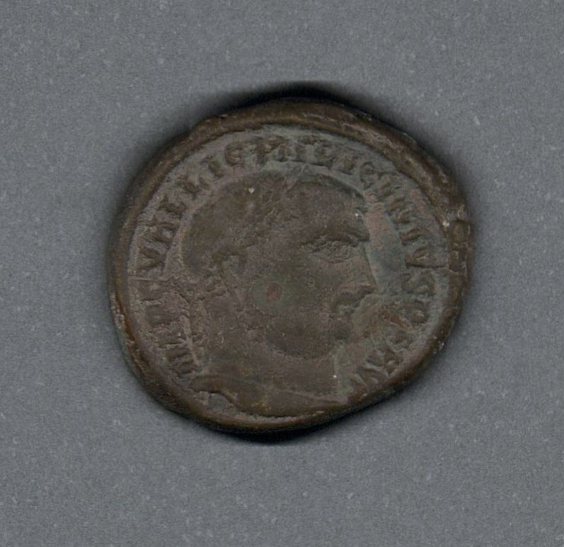 Moneda acuñada por el emperador Licinio I, como Augusto en paralelo a Constantino I y Maximino Daya, así como el usurpador Majencio, en el contexto de la guerra civil de la Tetrarquía. Anverso con el busto laureado del emperador Licinio I mirando a la derecha, leyenda "IMP C VAL LICIN LICINIVS P F AVG" y borde de puntos. Reverso con genio (espíritu protector) de pie mirando a la izquierda, llevando modio en la cabeza y capa sobre los hombros, sosteniendo una pátera con la mano derecha sobre un altar, leyenda "GENIO A-VGVSTI", en el campo "E", en el exergo "SM(N)" y borde de puntos. Fabricada por acuñación a martillo, peso de 4,4 gr.