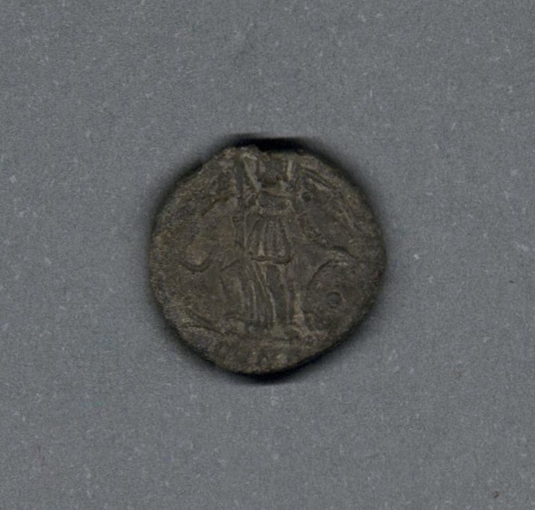 Pieza en estado de conservación regular, por lo que no es posible una identificación exacta, se propone una descripción tentativa a partir del tipo general y se sugiere mayor investigación. Moneda acuñada por el emperador Constantino I el Grande, como Augusto único, en conmemoración de la refundación de Bizancio como Constantinopla. Anverso con el busto de Constantinopla mirando a la izquierda, laureada sobre el casco, llevando manto imperial y sosteniendo una lanza sobre el hombro izquierdo, leyenda ilegible "(CONSTAN-TINOPOLI)" y borde de puntos. Reverso con la diosa Victoria dapeada y avanzando a la izquierda, con un pie sobre la proa de un barco y las alas extendidas, sosteniendo una lanza con la mano derecha y un escudo con la izquierda, anepígrafa, en el exergo "CONS(...)" y borde de puntos. Fabricada por acuñación a martillo, peso de 1,4 gr.