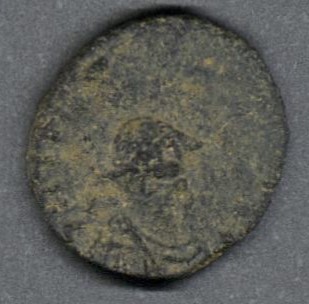 Pieza en mal estado de conservación, por lo que no es posible una identificación exacta y se propone una descripción general a partir del tipo, también se sugiere mayor investigación. Moneda posiblemente acuñada como imitación "bárbara" del periodo vándalo o por la dinastía teodosiana, por el emperador Teodosio II o Marciano en el Imperio romano de Oriente. Anverso con un busto de perfil de silueta poco convencional, podría ser resultado de un error de acuñación, leyenda ilegible. Reverso con una cruz dentro de una guirnalda, exergo desgastado. Fabricada por acuñación a martillo, peso de 0,7 gr.