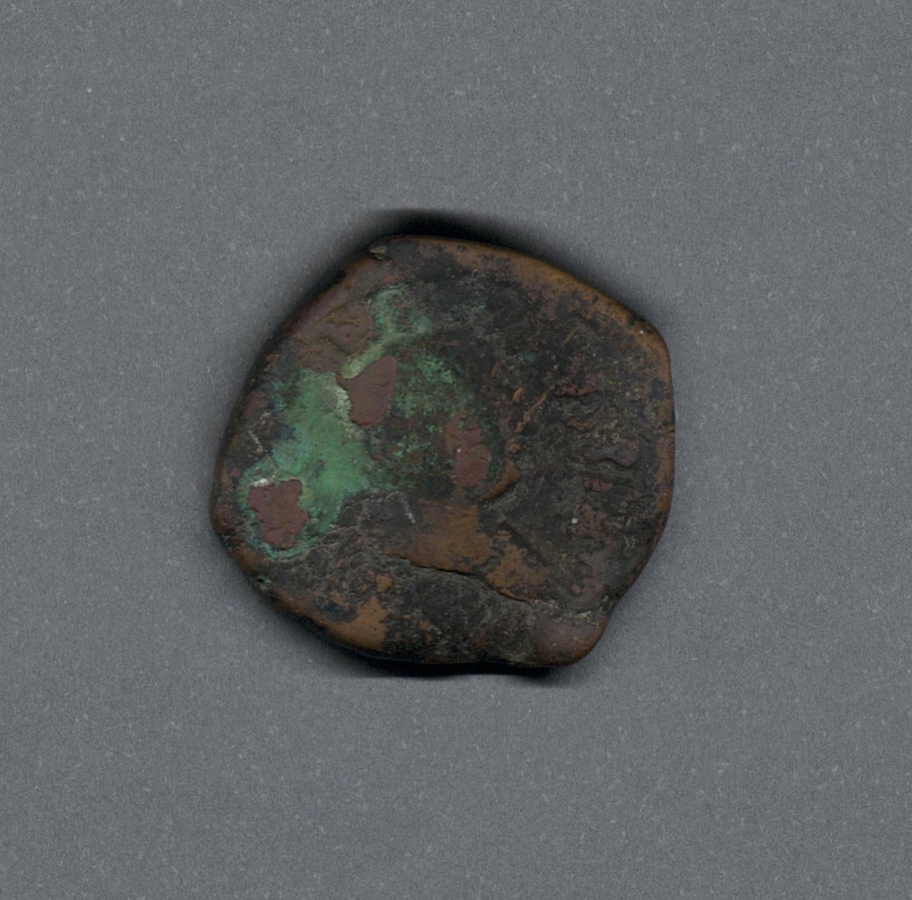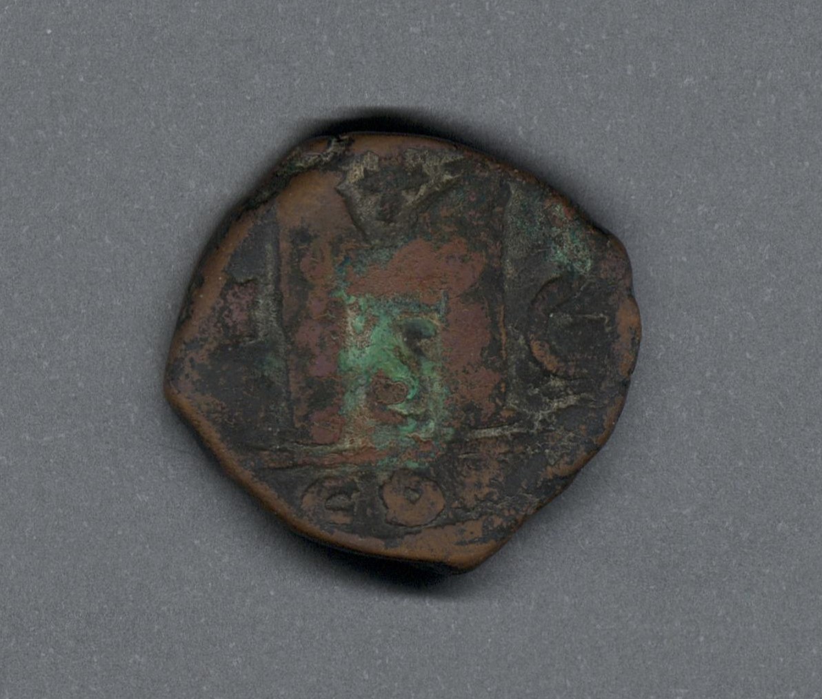Pieza en estado de conservación regular, por lo que no es posible una identificación exacta, se propone una descripción tentativa a partir del tipo general y se sugiere mayor investigación. Moneda probablemente acuñada por el emperador Anastasio I, después de la reforma monetaria. Anverso altamente desgastado, con un busto de perfil del emperador mirando a la derecha, leyenda parcialmente visible "(...)S P P AV/(G)" y borde de puntos. Reverso con una M grande con una cruz arriba, una estrella a la izquierda y una luna creciente a la derecha, debajo "E" y "CON" en el exergo, borde de puntos. Cospel pequeño. Fabricada por acuñación a martillo, peso de 13,2 gr.