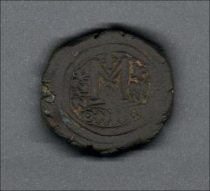 Pieza en estado de conservación regular, lo que no impide su identificación exacta. Moneda acuñada por el emperador Mauricio Tiberio. Anverso con el busto frontal del emperador Mauricio coronado, levando un globo con la mano derecha y un escudo con la izquierda, leyenda ilegible. Reverso con una M grande, con una cruz arriba, "ANNO" a la izquierda y "XIII" a la derecha verticalmente, abajo "B" y en el exergo "NIKO", borde de puntos. Cospel irregular.