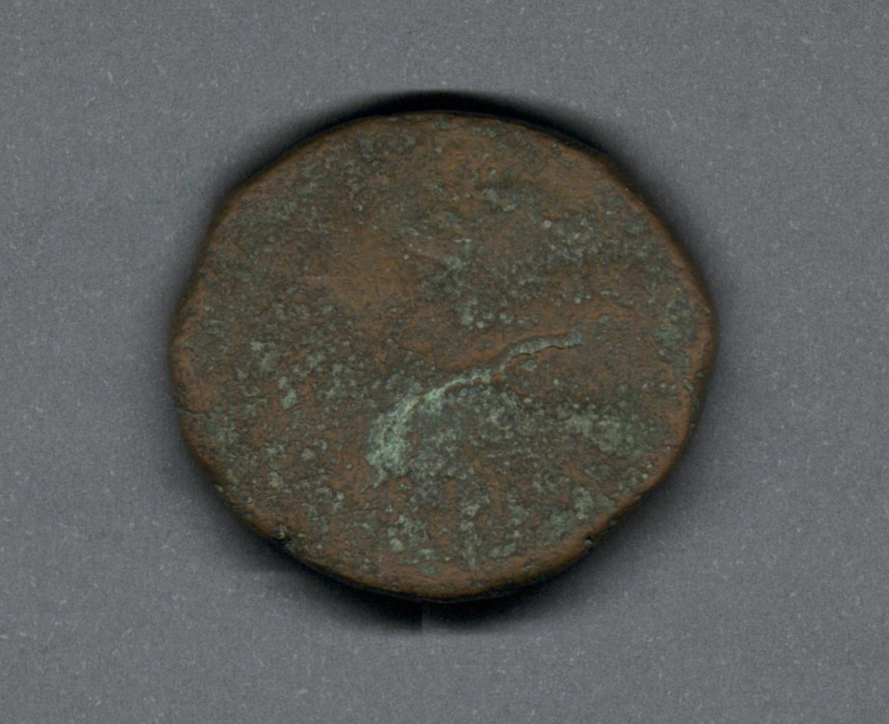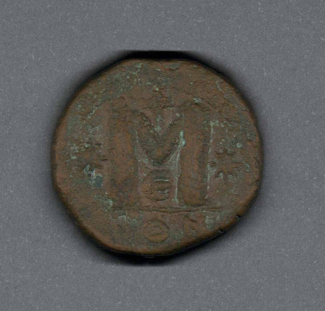 Pieza en estado de conservación regular, lo que no impide su identificación exacta. Moneda acuñada por el emperador Anastasio I, después de la reforma monetaria de las mones de cobre. Anverso muy desgastado, con la silueta del busto de perfil del emperador Anastasio I mirando a la derecha, llevando diadema de perlas y drapeado sobre la coraza, leyenda parcialmente visible "(D N ANASTA-S)IVS P P A(VG)". Reverso con M grande, con una estrella a cada lado y una cruz arriba, debajo "ε" y en el exergo "CON". Fabricada por acuñación a martillo, peso de 15,9 gr.