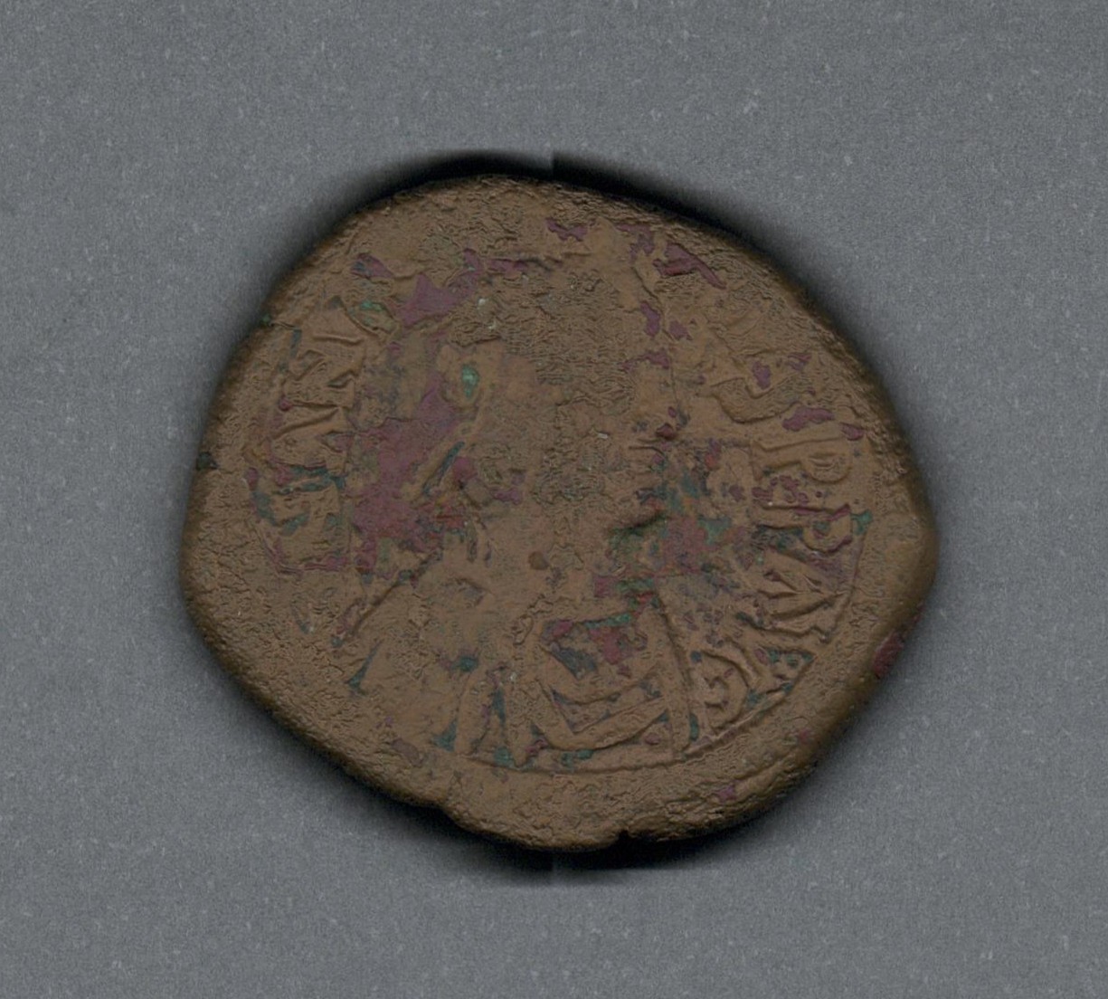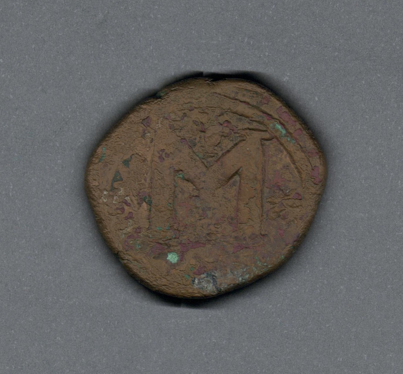Pieza en estado de conservación regular, por lo que no es posible una identificación exacta, se propone una descripción tentativa a partir del tipo general y se sugiere mayor investigación. Moneda acuñada por el emperador Anastasio I. Anverso con el busto de perfil del emperador Anastasio I mirando a la derecha, llevando diadema de perlas y drapeado sobre la coraza, leyenda "D N ANA(STASI)VS P P AVG" y borde de puntos. Reverso con una M grande, con una estrella a cada lado y una cruz arriba, desgastada debajo y en el exergo, borde de puntos. Fabricada por acuñación a martillo, peso de 16,8 gr.