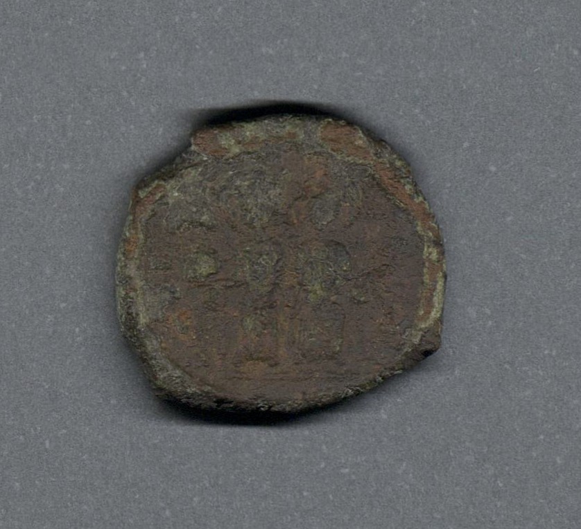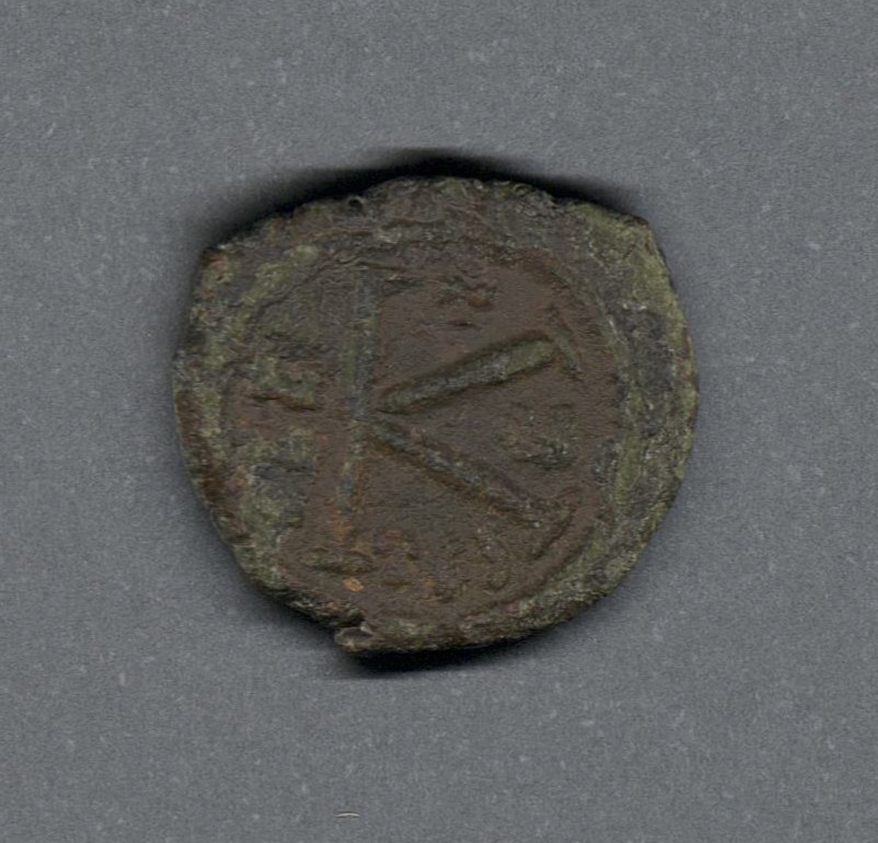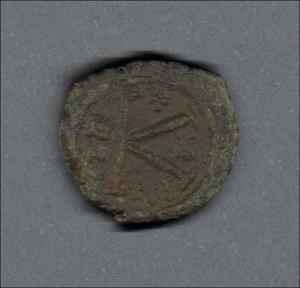 Pieza en estado de conservación regular, lo que no impide su identificación exacta. Medio follis o 20 nummi acuñada por el emperador Justino II. Anverso con el emperador Justino y la emperatriz Sofía entronados de frente, llevando halo, mientras el emperador sostiene un globo y la emperatriz, un cetro; leyenda ilegible y borde de puntos. Reverso con la letra K grande, "ANNO" verticalmente a la izquierda, arriba cruz, a la izquierda "H" y abajo "TES", borde de puntos. Fabricada por acuñación a martillo, peso de 4,5 gr.