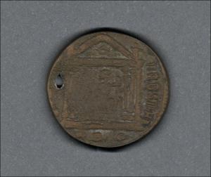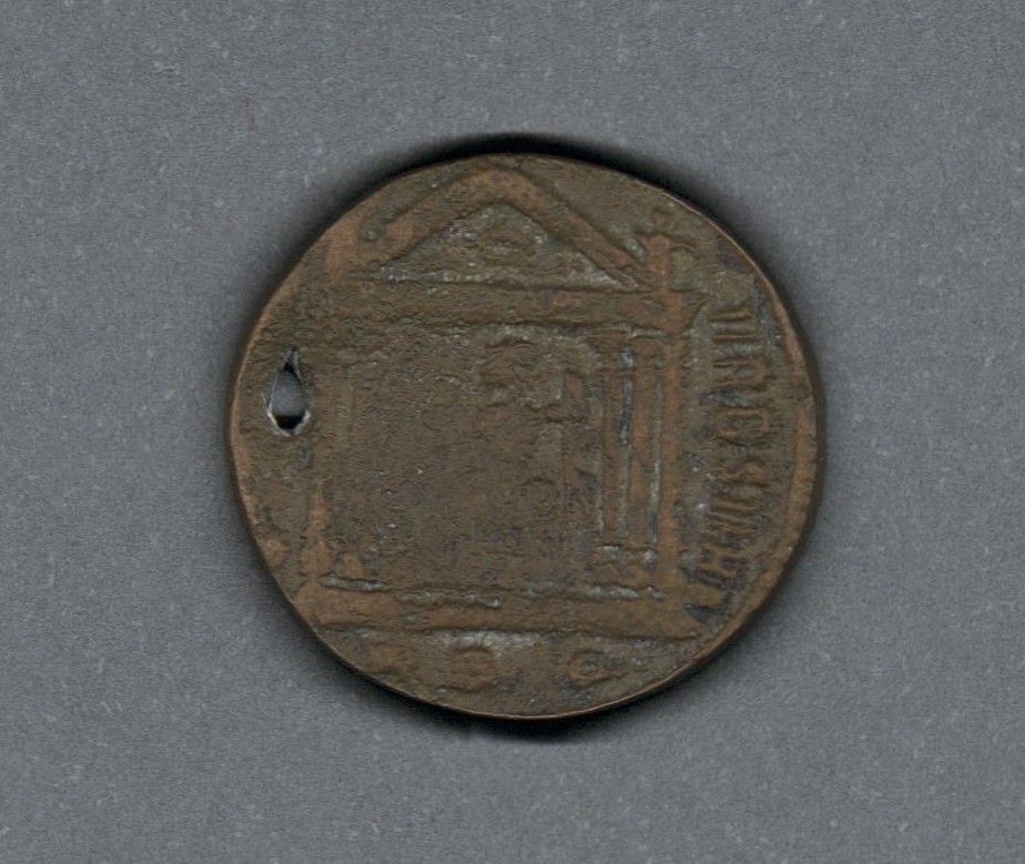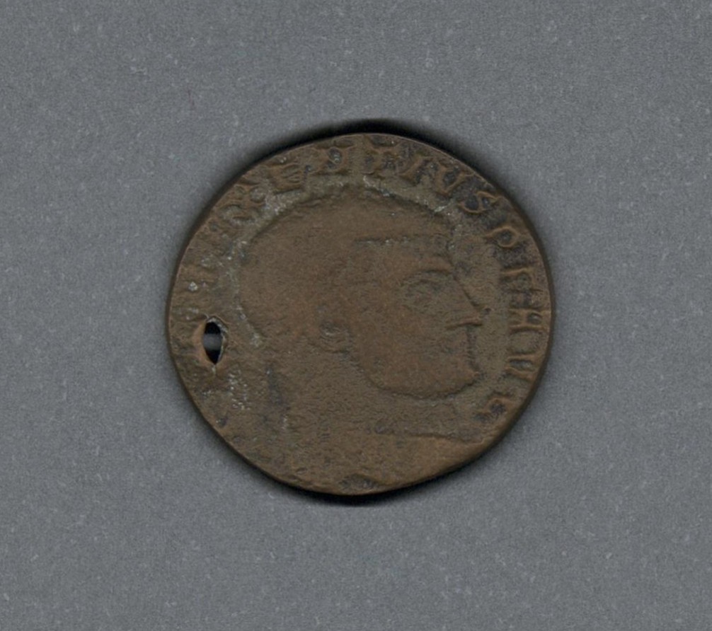 Pieza en estado de conservación regular, lo que no impide su identificación exacta. Moneda acuñada por el usurpador Majencio como Augusto, en el contexto de guerra civil en la Tetrarquía. Anverso con el busto laureado del emperador Majencio mirando a la derecha y leyenda parcialmente visible "(IMP C) MAXENTIVS P F AVG". Reverso con la diosa Roma entronada a la izquierda, sosteniendo un globo con la mano derecha y un cetro con la izquierda, dentro de un templo hexástilo, con Victorias como acróteras y una guirnalda en el frontón, leyenda parcialmente visible "(CONSERV)-VRB S(VAE)", en el exergo "RBQ" y borde de puntos. Cospel con orificio de lado a lado. Fabricada por acuñación a martillo, peso de 4,0 gr.