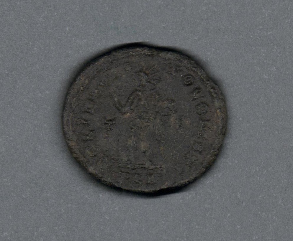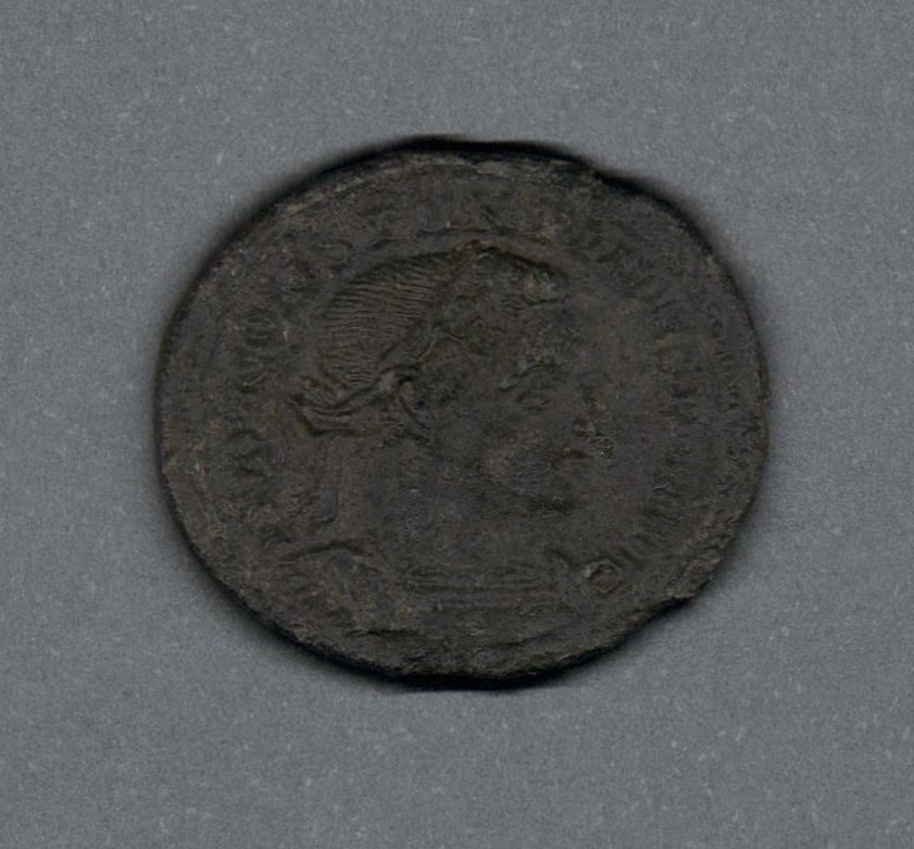 Pieza en estado de conservación regular, por lo que no es posible una identificación exacta, se propone una descripción tentativa a partir del tipo general y se sugiere mayor investigación. Moneda acuñada por el emperador Constantino I el Grande, como Augusto en el contexto de guerra civil en la Tetrarquía. Anverso con el busto laureado del emperador Constantino I llevando coraza y mirando a la derecha, leyenda parcialmente visible "(IMP) CONSTANTINVS (P F) AVG" y borde de puntos. Reverso con el dios Sol radiado pie a la izquierda, llevando capa sobre los hombros, levantando la mano derecha y sosteniendo un globo con la izquierda, leyenda parcialmente visible "(SOLI INVIC)-TO COMITI", "T/(F)" en el campo, "PLN" en el campo y borde de puntos. Fabricada por acuñación a martillo, peso de 3,3 gr.