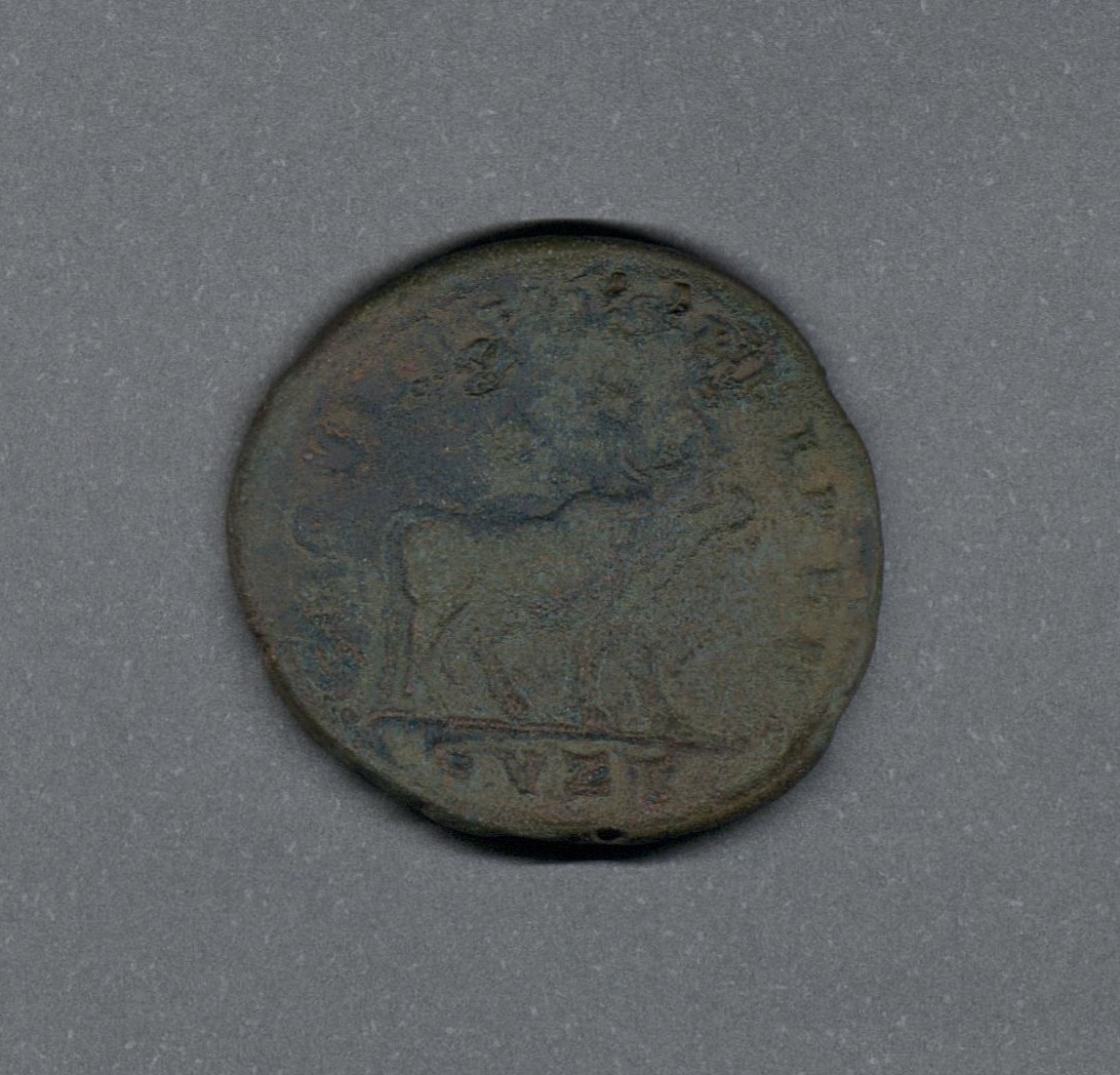 Moneda acuñada por el emperador Juliano II, el Apóstata, como Augusto único. Anverso con el busto del emperador Juliano II con barba, llevando diadema de perlas y drapeado sobre la coraza, leyenda "D N FL CL IVLI-ANVS P F AVG" y borde de puntos. Reverso con un toro a la derecha con dos estrellas de seis puntas arriba, leyenda desgastada "(SECVRITAS REIPVB)", en el exergo "CVZ(Γ)" y borde de puntos. Fabricada por acuñación a martillo, peso de 6,0 gr.