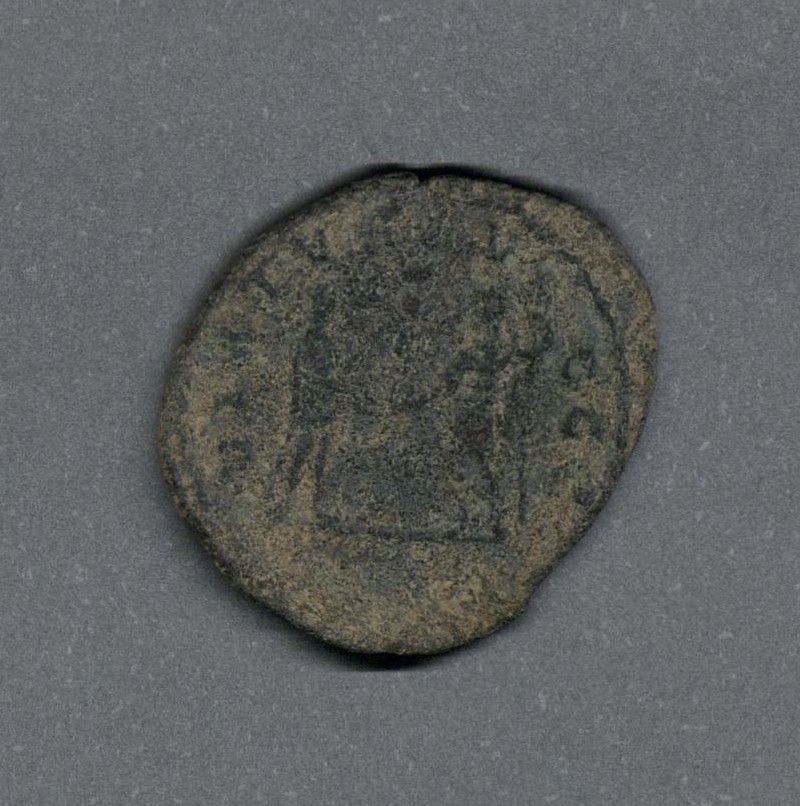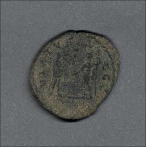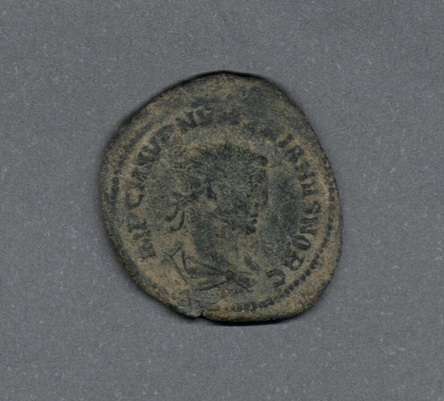 Pieza en estado de conservación regular, por lo que no es posible una identificación exacta, se propone una descripción tentativa a partir del tipo general y se sugiere mayor investigación. Moneda acuñada por Numeriano como César de su padre, el emperador Caro, en el llamado "Imperio central", una de las escisiones del Imperio romano durante la crisis del siglo tercero. Anverso con el busto radiado del César Numeriano drapeado sobre la coraza, mirando a la derecha, leyenda "IMP C M AVR NVMERIANVS NOB C" y borde de puntos. Reverso con el César Numeriano de pie en atuendo militar, recibiendo un globo de Júpiter de pie, ambos sostienen un cetro; leyenda "VIRTVS AVGG(•)", marca de ceca y de control desgastadas en el exergo y en el campo, borde de untos. Cospel grande, alargado. Fabricada por acuñación a martillo, peso de 2,2 gr.