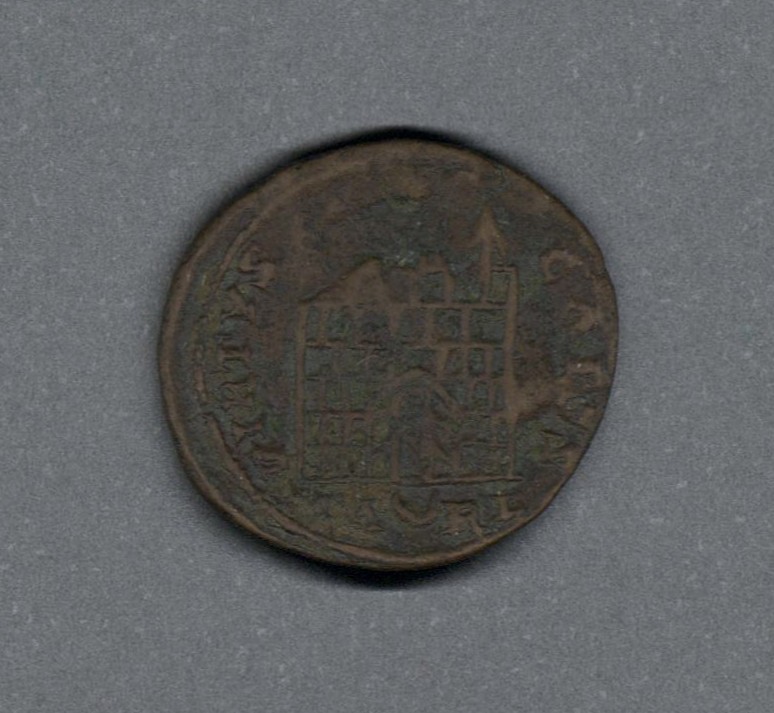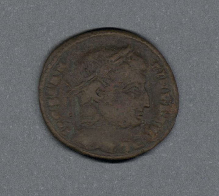 Pieza híbrida, por lo que se propone una descripción y se sugiere mayor investigación. Moneda acuñada por el emperador Constantino I, el Grande, como Augusto único del imperio, junto a sus hijos como Césares. Anverso con el busto laureado del emperador Constantino I mirando a la derecha, leyenda "CONSTAN-TINVS AVG" y borde de puntos. Reverso con una puerta de campamento con una estrella arriba, leyenda "VIRTVS - CAESS", en el exergo "TA(media luna horizontal)RL" y borde de puntos; acuñación ligeramente descentrada. Fabricada por acuñación a martillo, peso de 2,2 gr.