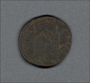 | Moneda de bronce acuñada en la ceca de Arelate cuando fue renombrada como Constantina, actual Arlés en Francia |