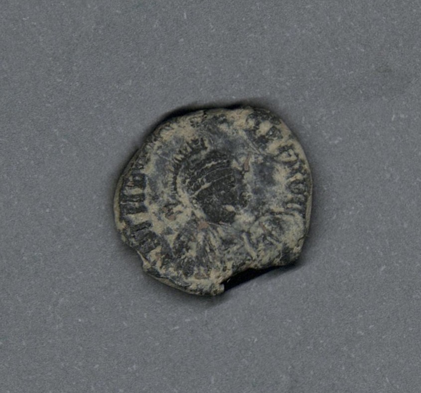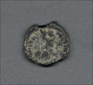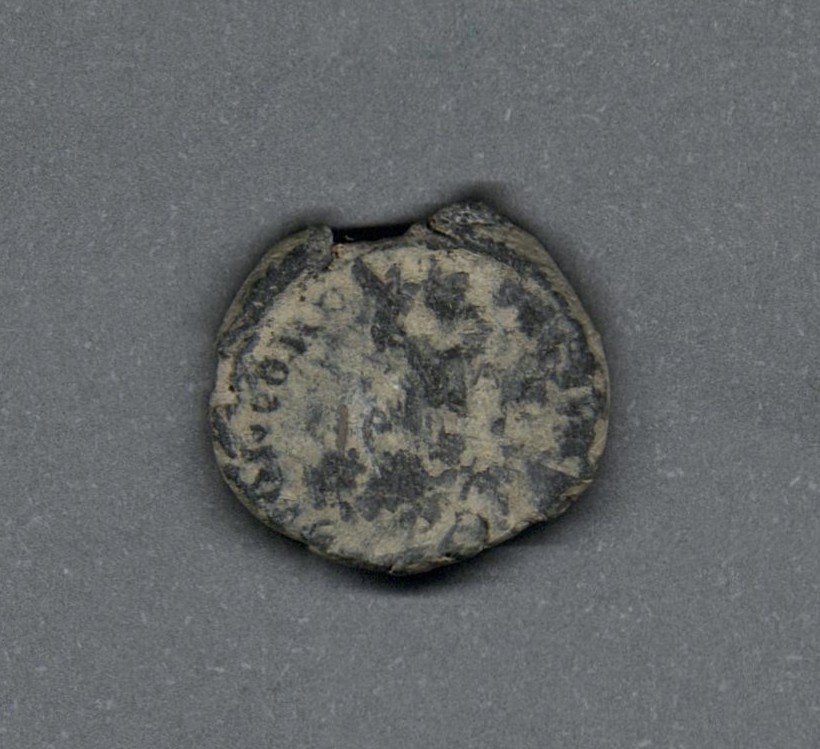 Pieza en estado de conservación regular, por lo que no es posible una identificación exacta, se propone una descripción tentativa a partir del tipo general y se sugiere mayor investigación. Moneda posiblemente acuñada por el emperador Teodosio II. Anverso con el busto frontal del emperador llevando casco, coraza, lanza y escudo, leyenda parcialmente visible "(D)N THE(...) P F AVG". Reverso posiblemente con Constantinopla drapeada y entronada mirando a la izquierda, leyenda "CONCORDI-(...)", exergo desgastado y borde de puntos. Cospel con muesca. Fabricada por acuñación a martillo, peso de 2,5 gr.