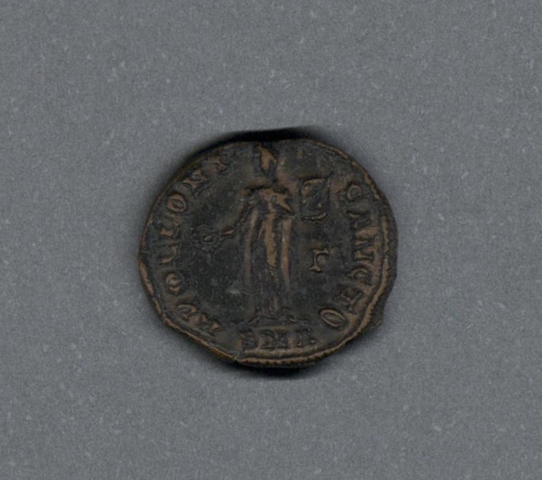 Moneda provincial acuñada en el contexto de las persecusiones al cristianismo en el Oriente del Imperio romano bajo el emperador Maximino Daya. Anverso con la diosa Tyche drapeada con corona mural y velo de frente, sentada sobre una roca, abajo el río Orontes nadando, leyenda "GENIO AN-TIOCHENI" y borde de puntos. Reverso con el dios Apolo de pie a la izquierda, realizando una libación con la mano derecha, con la que sostiene una pátera, en la mano izquierda lleva una lira, leyenda "APOLLONI - SANCTO", en el campo derecho "Γ", en el exergo "SMA" y borde de puntos. Fabricada por acuñación a martillo, peso de 1,4 gr.
