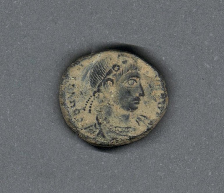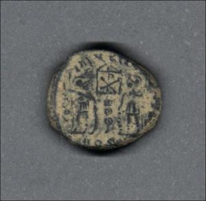 Pieza en estado de conservación regular, lo que no impide su identificación exacta. Moneda acuñada por el emperador Constante o Constancio II. Anverso con el busto del emperador drapeado sobre la coraza y llevando diadema de roseta, mirando a la derecha, leyenda parcialmente visible y borde de puntos. Reverso con dos soldados de pie, sosteniendo una lanza y afirmándose en el escudo, un estandarte militar entre ellos con el crismón "☧", leyenda parcialmente visible "GLOR-IA EXERC-ITVS", en el exergo "(☧)AQS" y borde de puntos. Cospel ovalado y pequeño. Fabricada por acuñación a martillo, peso de 2,6 gr.