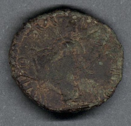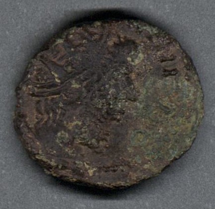 Pieza en mal estado de conservación, por lo que no es posible una identificación exacta y se propone una descripción general a partir del tipo, también se sugiere mayor investigación. Moneda probablemente acuñada por el emperador Tétrico I en el llamado "Imperio galo", una de las escisiones del Imperio romano durante la crisis del siglo tercero. Anverso con el busto radiado del emperador mirando a la derecha, posible error de acuñación con doble martillazo o sobreacuñación, leyenda ilegible y borde de puntos. Reverso desgastado, leyenda ilegible y borde de puntos. Fabricada por acuñación a martillo, peso de 2,4 gr.