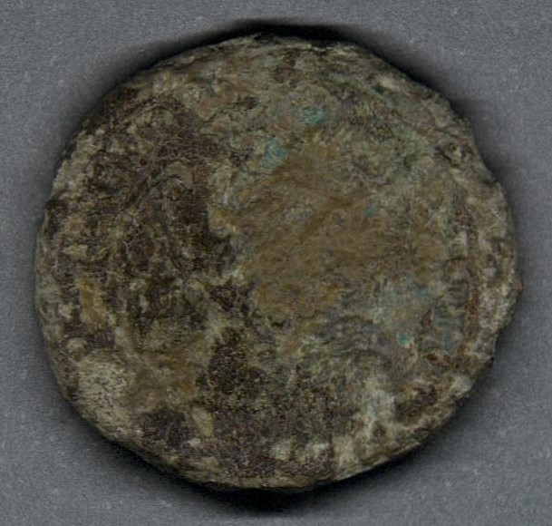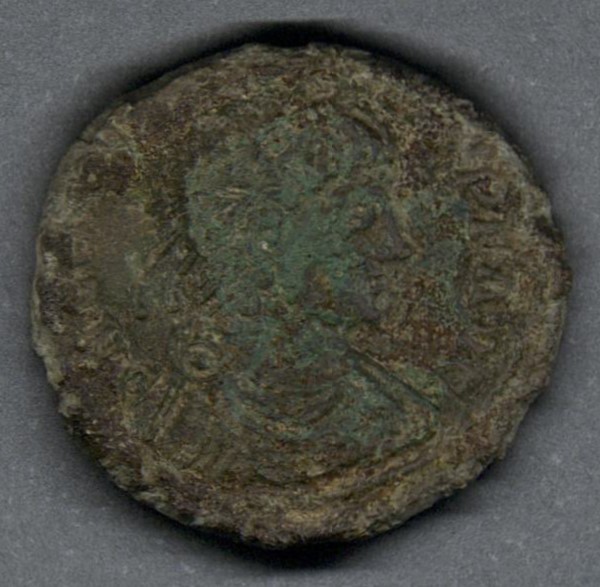 Pieza en mal estado de conservación, por lo que no es posible una identificación exacta y se propone una descripción general a partir del tipo, también se sugiere mayor investigación. Moneda probablemente acuñada durante el siglo cuarto. Anverso con el busto del emperador llevando diadema de perlas y drapeado sobre la coraza, mirando a la derecha y leyenda ilegible. Reverso desgastado. Fabricada por acuñación a martillo, peso de 6,2 gr.