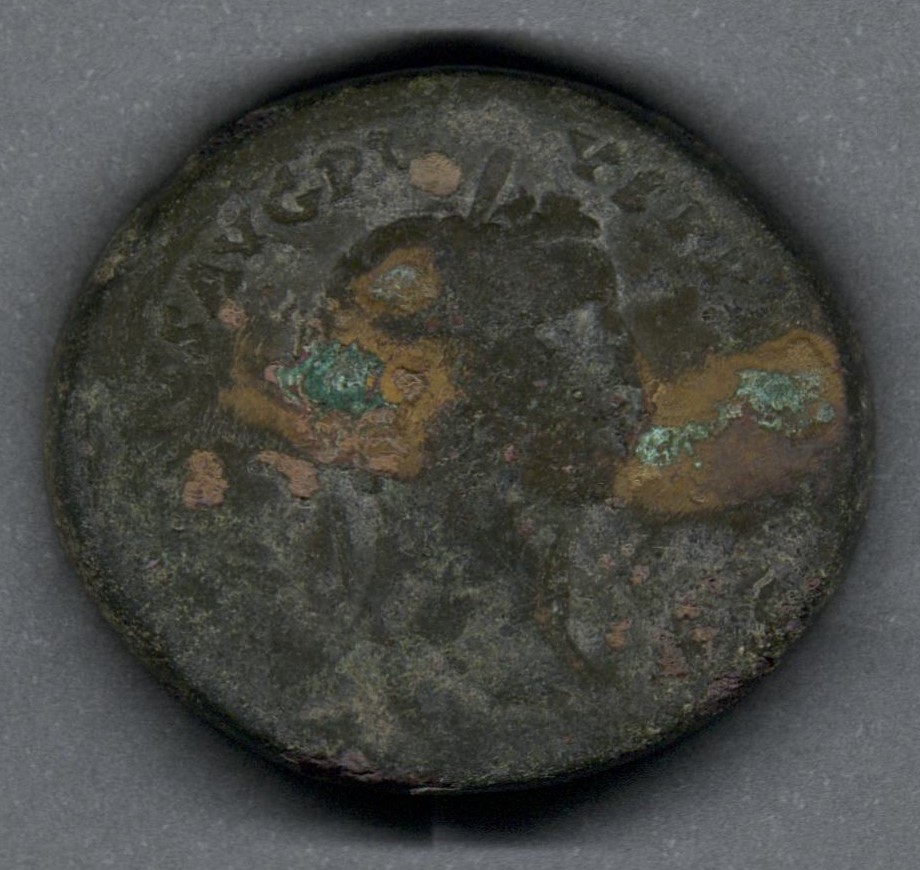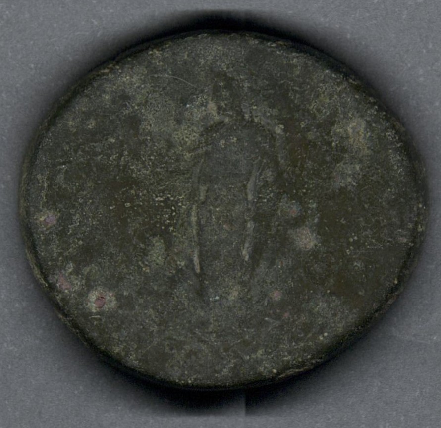 Pieza en mal estado de conservación, por lo que no es posible una identificación exacta y se propone una descripción general a partir del tipo, también se sugiere mayor investigación. Moneda posiblemente acuñada por el emperador Antonino Pío, de acuerdo con la leyenda fragmentaria, aunque el estilo del busto evoca más a Heliogábalo. Anverso con el busto laureado del emperador mirando a la derecha y leyenda parcialmente visible "(...)S AVG PI-VS PP TR(...)". Reverso con una diosa drapeada de pie a la izquierda, leyenda ilegible y en el campo "S - C". Fabricada por acuñación a martillo, peso de 21,8 gr.