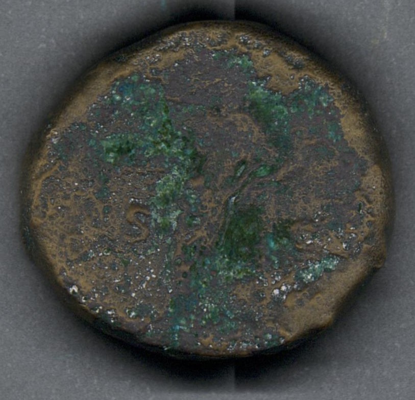Pieza en mal estado de conservación, por lo que no es posible una identificación exacta y se propone una descripción general a partir del tipo, también se sugiere mayor investigación. Moneda probablemente acuñada por el emperador Trajano, de acuerdo con el estilo. Anverso desgastado con busto a la derecha y leyenda ilegible. Reverso con diosa drapeada de pie a la izquierda, llevando cornucopia con la mano izquierda, "S C" en el campo y leyenda ilegible. Fabricada por acuñación a martillo, peso de 20, 6 gr.