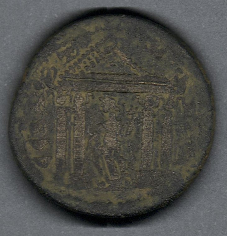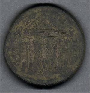 Pieza en estado de conservación regular, por lo que no es posible una identificación exacta, se propone una descripción tentativa a partir del tipo general y se sugiere mayor investigación. Moneda provincial del Imperio oriental, acuñado probablemente durante la dinastía Severa, en honor de Caracalla, Geta o Heliogábalo. Anverso con el busto laureado del emperador, drapeado sobre la coraza y mirando a la derecha, leyenda ilegible. Reverso con un tempo de cuatro columnas y escultura drapeada dentro, leyenda ilegible. Fabricada por acuñación a martillo, peso de 9,5 gr.