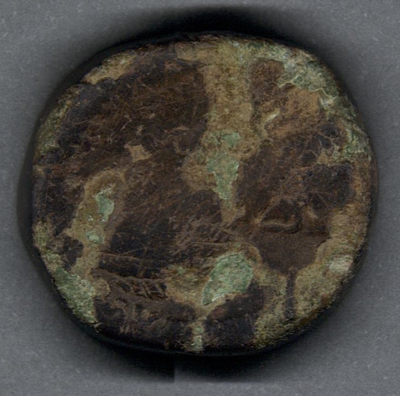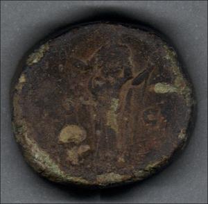 Pieza en mal estado de conservación, por lo que no es posible una identificación exacta y se propone una descripción general a partir del tipo, también se sugiere mayor investigación. Moneda probablemente acuñada por la dinastía Julio-Claudia, Flavia o Antonina entre la segunda mitad del siglo primero hasta la primeras décadas del siglo segundo. Anverso con un busto femenino a la derecha, llevando el pelo tomado en una cola baja o trenza, leyenda ilegible. Reverso con diosa drapeada de pie a la izquierda, leyenda ilegible y en el campo "S C". Fabricada por acuñación a martillo, peso de 20,0 gr.