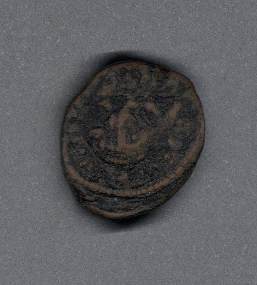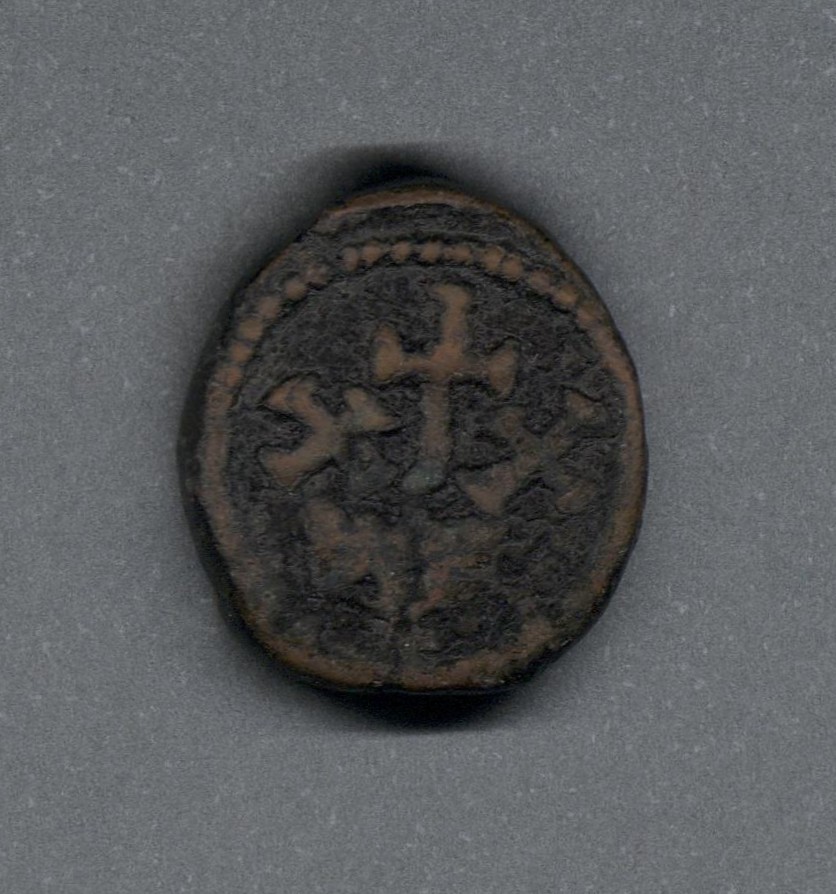 Pieza en estado de conservación regular, por lo que no es posible una identificación exacta, se propone una descripción tentativa a partir del tipo general y se sugiere mayor investigación. Moneda posiblemente acuñada por el emperador Constante II. Anverso con el busto frontal del emperador llevando corona y manto sobre los hombros. leyenda ilegible y borde de puntos. Reverso con XX y una gran cruz en medio, debajo marca de ceca borrosa y borde de puntos. Acuñación descentrada en el anverso y cospel alargado. Fabricada por acuñación a martillo, peso de 7,7 gr.