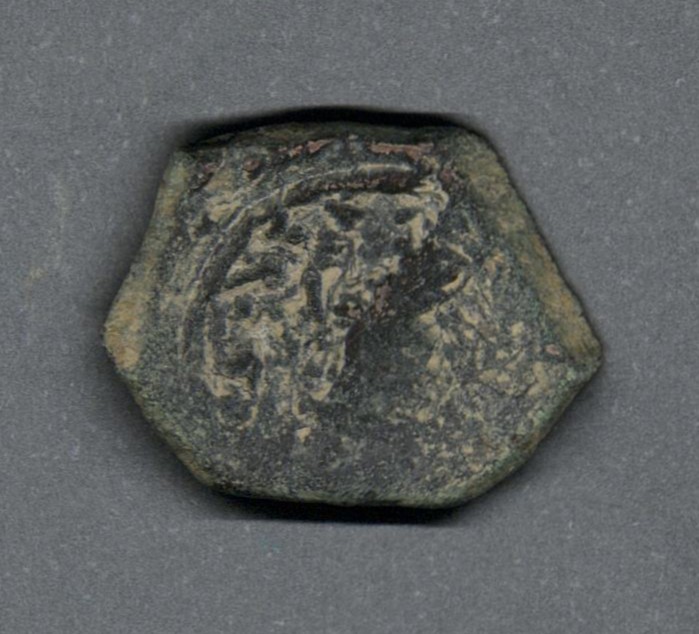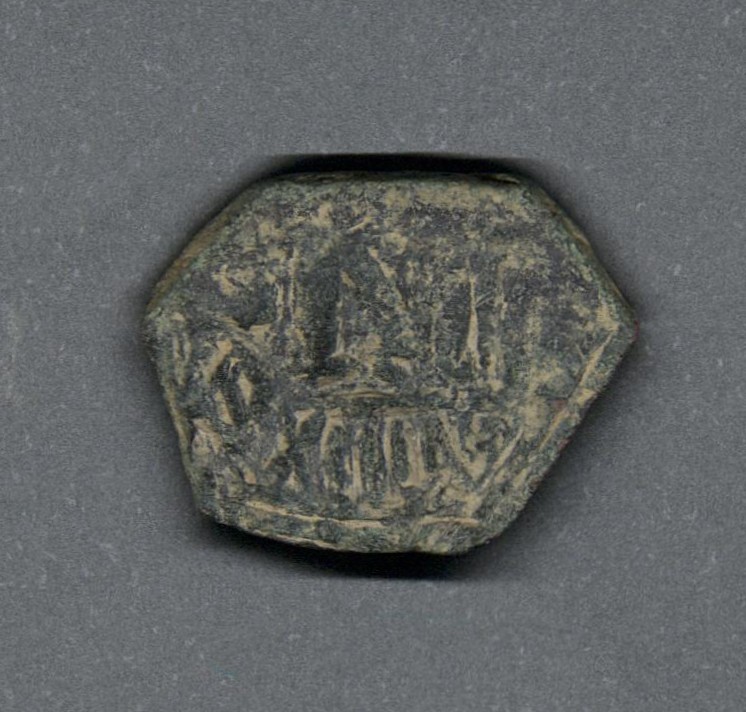 Pieza en estado de conservación regular, por lo que no es posible una identificación exacta, se propone una descripción tentativa a partir del tipo general y se sugiere mayor investigación. Moneda posiblemente acuñada por el emperador Constante II. Anverso desgastado, leyenda ilegible. Reverso con M grande, a la izquierda posiblemente "(AN)A" verticalmente, en el exergo año de reinado "XIIII", campo derecho desgastado. Cospel hexagonal. Fabricada por acuñación a martillo, peso de 3,0 gr.
