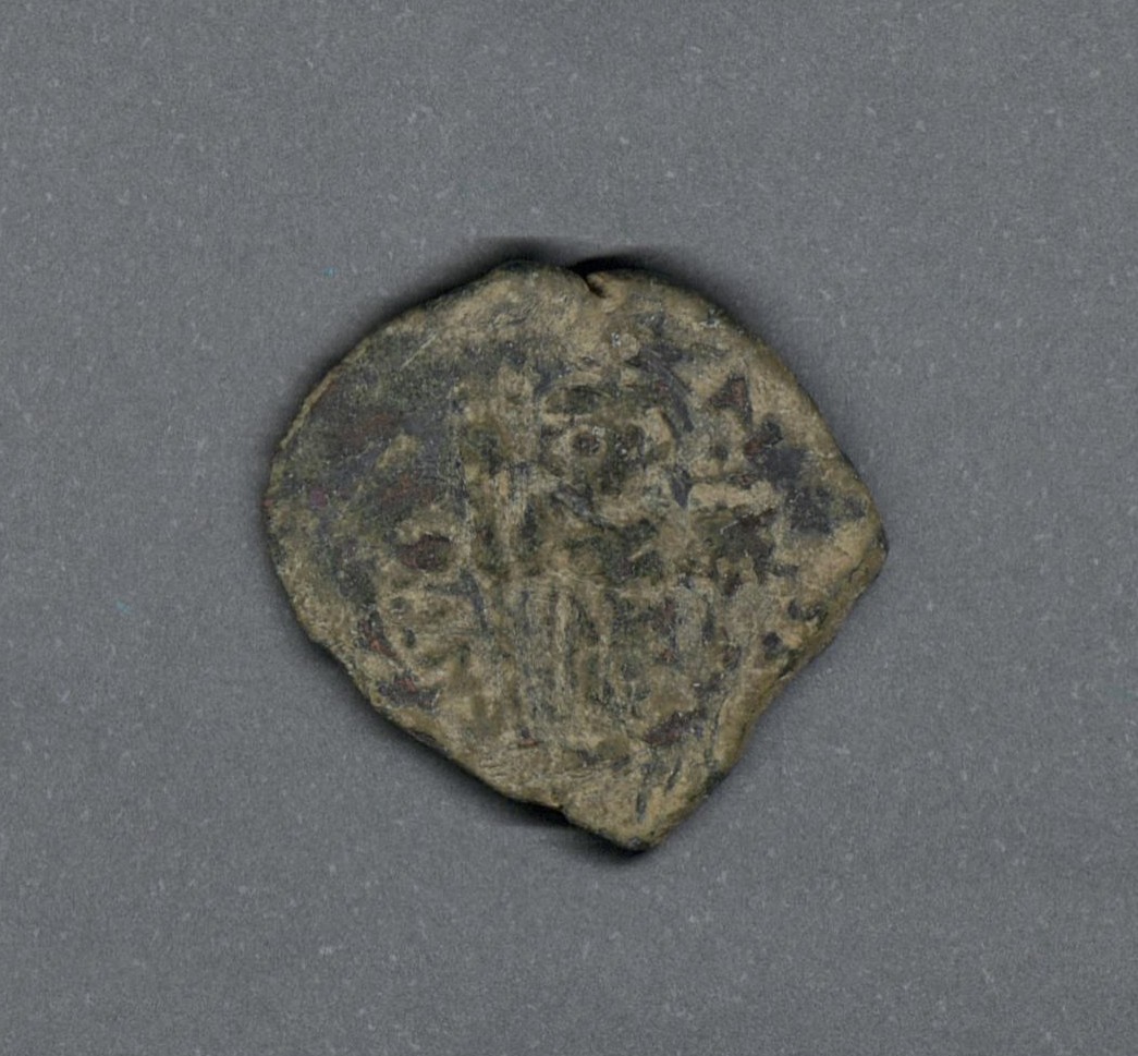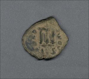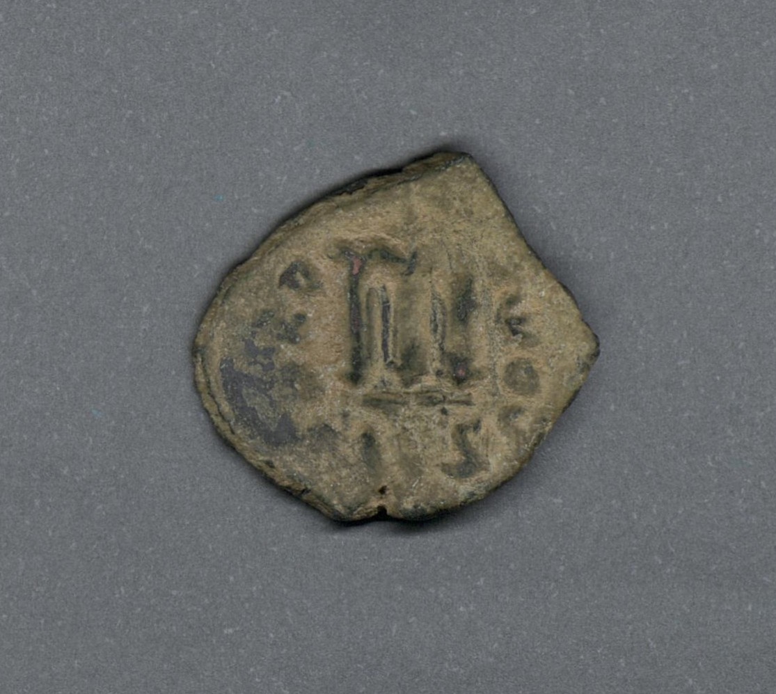 Pieza en estado de conservación regular, por lo que no es posible una identificación exacta, se propone una descripción tentativa a partir del tipo general y se sugiere mayor investigación. Moneda acuñada por el emperador Tiberio II, Mauricio o Focas. Anverso más desgastado, con el busto frontal del emperador coronado, llevando túnica consular, cetro y mapa, leyenda ilegieble. Reverso con M grande, cruz arriba, a la izquierda "ANNO", a la derecha ilegible, exergo desgatado. Fabricada por acuñación a martillo, cospel recortado y peso reducido en 4,7 gr.