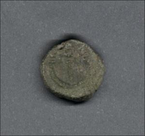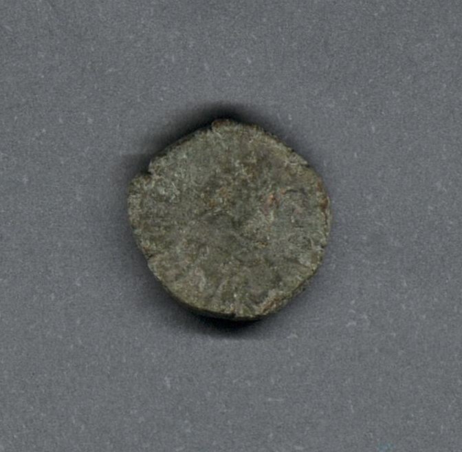 Pieza en estado de conservación regular, por lo que no es posible una identificación exacta, se propone una descripción tentativa a partir del tipo general y se sugiere mayor investigación. Moneda posiblemente acuñada por el emperador Justiniano I. Anverso con el busto del emperador mirando a la derecha, llevando diadema de perlas y drapeado sobre la coraza, leyenda ilegible. Reverso con E grande y delta a la derecha, borde de puntos. Fabricada por acuñación a martillo, peso de 2,1 gr.