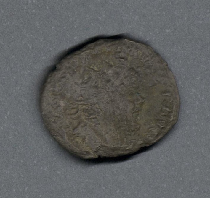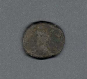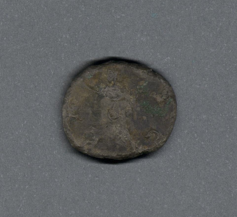 Pieza en estado de conservación regular, por lo que no es posible una identificación exacta, se propone una descripción tentativa a partir del tipo general y se sugiere mayor investigación. Moneda posiblemente acuñada por el emperador Póstumo en el llamado "Imperio galo", una de las escisiones del Imperio romano durante la crisis del siglo tercero. Anverso con el busto radiado del emperador llevando coraza y mirando a derecha, leyenda ilegible y borde de puntos. Reverso con una diosa drapeada de pie a la izquierda y leyenda ilegible. Cospel alargado. Fabricada por acuñación a martillo, peso de 3,1 gr.