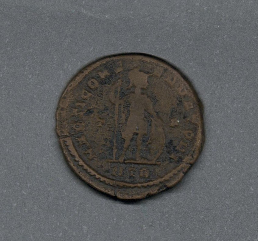 Moneda acuñada por el emperador Constantino I el Grande, como Augusto en el contexto de Guerra Civil de la Tetrarquía. Anverso con el busto laureado del emperador Constantino I llevando coraza y mirando a la derecha, leyenda "CONSTANT(I)NVS P F AVG" y borde de puntos. Reverso con el dios Marte de pie a la derecha, llevando casco y sosteniendo un escudo con l amano derecha y una lanza transversal con la mano izquierda, leyenda "M(AR)TI CON-SERVATORI", en el campo "T/F", en el exergo "ATR" y borde de puntos. Fabricada por acuñación a martillo, peso de 2,4 gr.