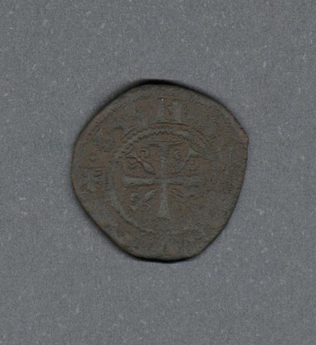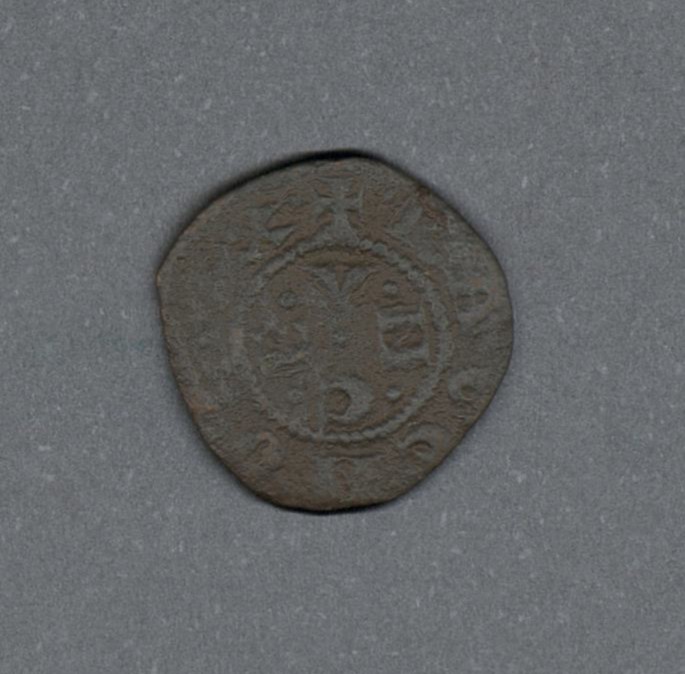Pieza en estado de conservación regular, por lo que no es posible una identificación exacta, se propone una descripción tentativa a partir del tipo general y se sugiere mayor investigación. Moneda acuñada en la región de Normandía en el Reino francés de los Capetos. Anverso con el monograma de la ceca de Caen como "C·E·A·N·"dentro de un círculo de puntos, leyenda ilegible y borde de puntos. Reverso con cruz latina con flores de lis en los ángulos, dentro de un borde de puntos, leyenda ilegible y borde de puntos. Fabricada por acuñación a martillo, peso de 0,8 gr.
