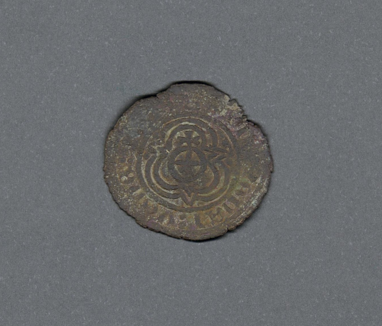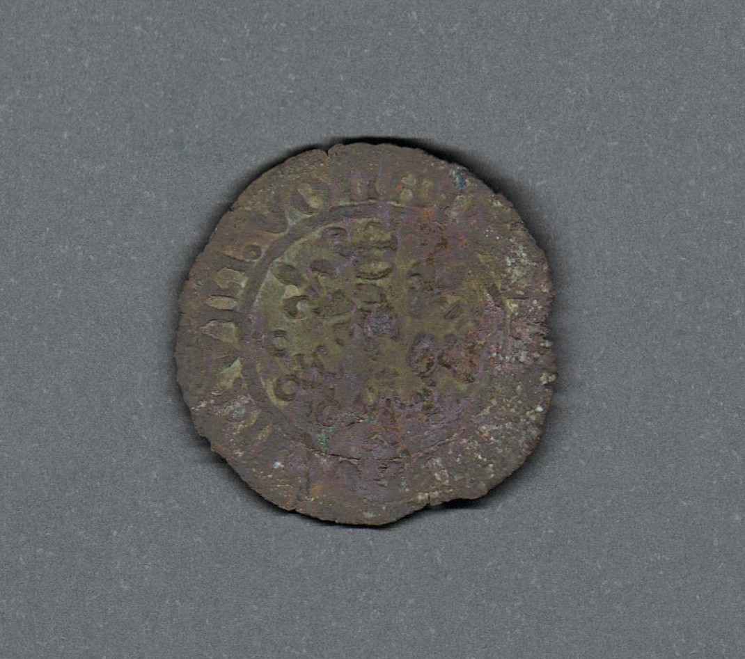 Pieza en estado de conservación regular, por lo que no es posible una identificación exacta, se propone una descripción tentativa a partir del tipo general y se sugiere mayor investigación. Ficha de contabilidad acuñada en la ciudad indepediente de Núremberg dentro del Sacro Imperio Romano Germano durante el siglo dieciséis. Anverso con una roseta en el centro, rodeada de tres flores de lis y tres coronas alternadas, dentro de un borde de puntos, leyenda ilegible. Reverso con un globo cruceiforme dentro de un triolóbulo doble y borde de puntos, leyenda ilegible. Cospel fabricado por fundición y acuñada a martillo, peso de 1,3 gr.