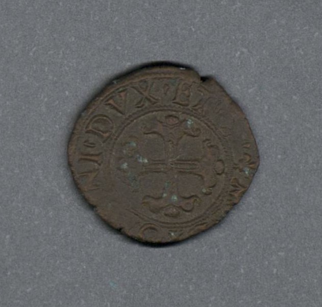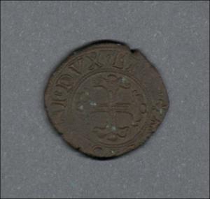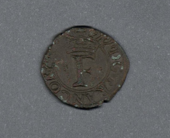 Pieza en estado de conservación regular, lo que no impide su identificación exacta. Moneda acuñada por el rey Francisco I de Francia, en el Ducado de Milán. Anverso con una F coronada dentro de un borde punteado, leyenda parcialmente visible "(FR) D G FRANCOR (REX)" y borde de puntos. Reverso con un crosslet dentro de un borde punteado, leyenda parcialmente visible "(MEDIOLA)NI DVX ET (C)" y borde de puntos. Fabricada por acuñación a martillo, pero de 0,9 gr.