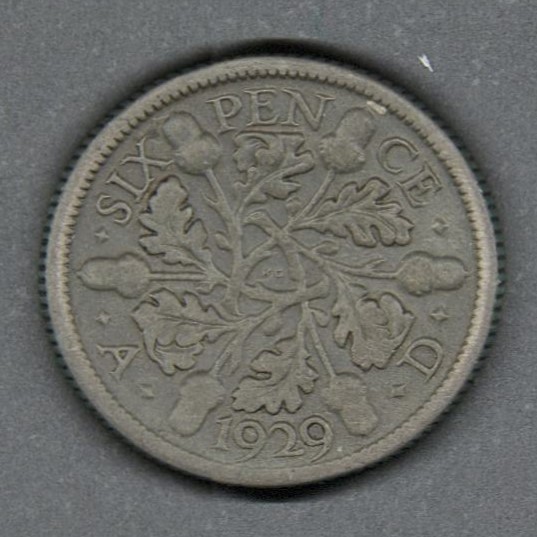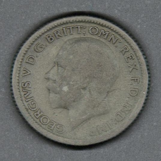 Monedas circulantes normales de Reino Unido. En anverso retrato sin corona del rey Jorge V mirando a la izquierda, leyenda alrededor. En reverso tres ramas de roble con seis bellotas, denominación arriba, fecha abajo.