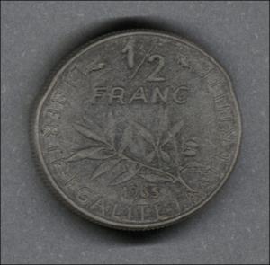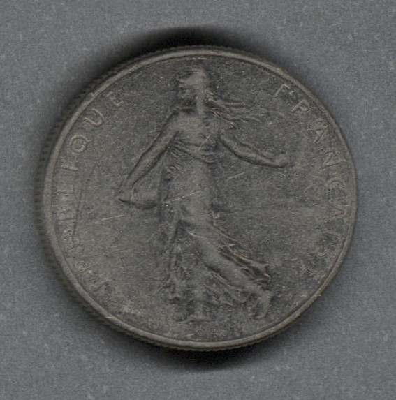 Moneda circulante normal de Francia. En anverso presenta a la República, a la izquierda, bajo la apariencia de un sembrador con gorro frigio y largos cabellos, camina y siembra contra el viento; al fondo, detrás del sembrador de la derecha, un sol naciente. Al reverso rama de olivo, sobre la cual reposa la denominación, abajo el año y alrededor la leyenda "LIBERTE. EGALITE. FRATERNITE.". El grabador de ambas caras fue Louis-Oscar Roty. El diseño del canto es llano.